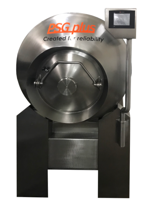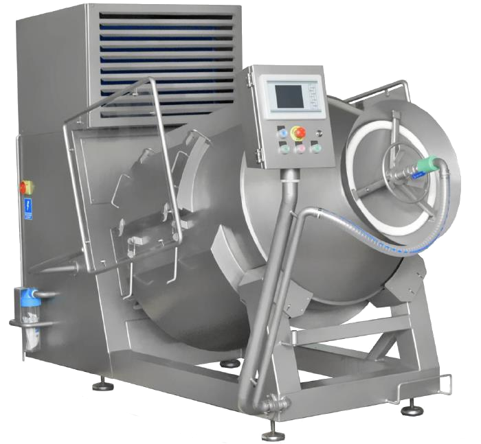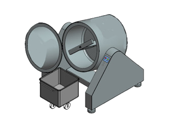 Назначение: массирование мясных продуктов после инъектирования либо в рассоле под вакуумом. Весь процесс контролируется электронной системой управления. Вращение барабана при помощи электромотора через редуктор с цепным приводом. Лопасти внутри барабана щадяще массируют продукт. Выгрузка продута из барабана происходит за счет реверса. Обороты барабана регулируются при помощи частотного преобразователя. Процесс массирования происходит с использованием импульсного вакуума.